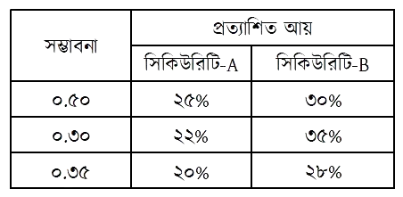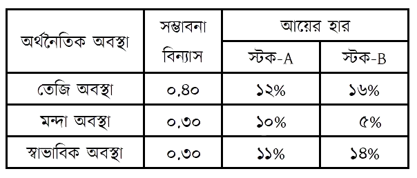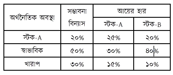 মি. হাসান কোম্পানির অর্থনৈতিক, অবস্থা চিন্তা করে দুটি। স্টকে বিনিয়োগ করার সিদ্ধান্ত গ্রহণ করলেন। নিচে স্টক দুটির সম্ভাবনা ও আয়ের হার দেওয়া হলো-