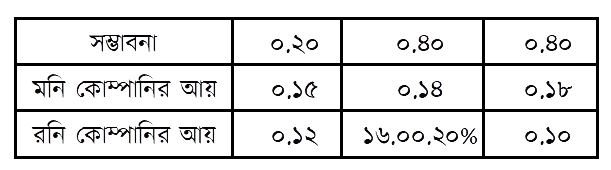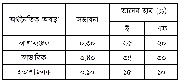 জনাব ইকবাল চাকুরির পাশাপাশি শেয়ার বাজারে বিনিয়োগ করতে আগ্রহী। তিনি বিভিন্ন অর্থনৈতিক অবস্থা বিবেচনা করে বিনিয়োগের জন্য ই ও এফ নামে দুইটি শেয়ার পছন্দ করেছেন। শেয়ার দুইটির আয়ের হার ও সম্ভাবনা নিম্নরূপ-