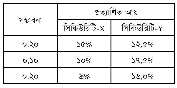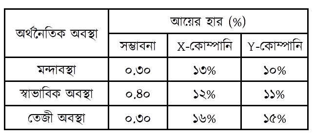 কর্ণফুলী লিমিটেড ৩,০০,০০০ টাকা 'X' কোম্পানির শেয়ারে এবং ২,০০,০০০ টাকা 'Y' কোম্পানির শেয়ারে বিনিয়োগ। করল। বিভিন্ন অর্থনৈতিক অবস্থায় শেয়ার দু'টির আয়ের হার নিম্নরূপ: