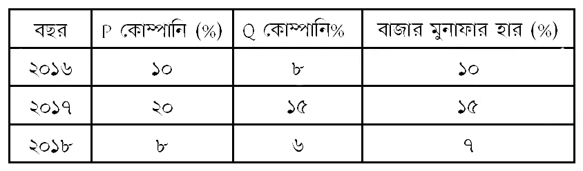 জনাব সৌরভ P ও Q নামক দুইটি-কোম্পানির মধ্যে যেকোনো একটিতে বিনিয়োগ করতে আগ্রহী। বিনিয়োগের ক্ষেত্রে তিনি বাজার ঝুঁকিকে বিশেষভাবে বিবেচনা করেন। বিগত ৩ বছরের P ওQ কোম্পানির বাজার মুনাফার হার দেওয়া হলো-