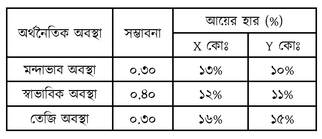 মি. পরশ সাম্স ৫০,০০০ টাকা 'X' কোম্পানির শেয়ারে এবং ২০,০০০ টাকা 'Y' কোম্পানির শেয়ারে বিনিয়োগ করলেন। বিভিন্ন অর্থনৈতিক অবস্থায় শেয়ার দুটির আয়ের হার নিম্নরূপ: