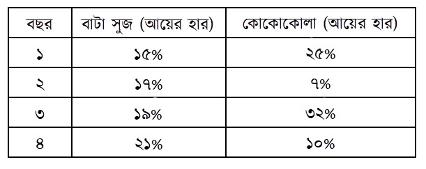 মিথুন একজন বিনিয়োগকারী। তার কিছু অর্থ তিনি শেয়ার বাজারে বিনিয়োগ করতে চান। সেই উদ্দেশ্যে তিনি শেয়ার বাজার। থেকে বাটা সুজ ও কোকাকোলার বিগত ৪ বছরের মুনাফা অর্জনের তথ্য সংগ্রহ করলেন। তথ্যগুলো নিচে দেওয়া হলো-
