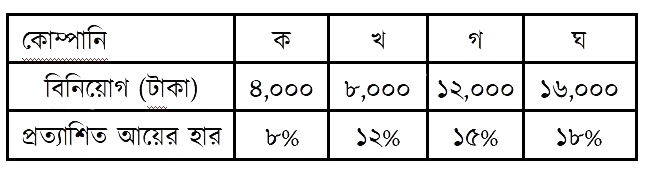 ক. ঝুঁকি কী? খ. পোর্টফোলিও বলতে কী বোঝায়? গ. কোম্পানি দুটির গড় আয়ের হার নির্ণয় করো। ঘ. কোন কোম্পানিতে বিনিয়োগ করা উচিত তা আদর্শ বিচ্যুতি ও বিভেদাঙ্ক নির্ণয় করে মন্তব্য করো।