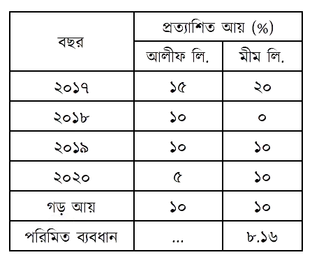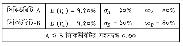 জনাব রিয়াজ গত বছর দুটি সিকিউরিটির সমন্বয়ে একটি পোর্টফোলিও গঠন করেন, যেখানে তার পোর্টফোলিও ঝুঁকি ছিল ১৫%। বর্তমানে তিনি নিম্নোক্ত দুটি সিকিউরিটির সমন্বয়ে নতুন পোর্টফোলিও গঠন করতে আগ্রহী :