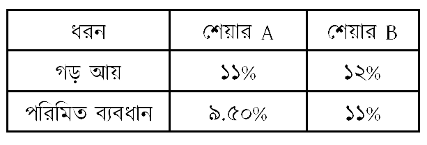 মি. M মুনাফা ও ঝুঁকি বিশ্লেষণ করে বিনিয়োগ সিদ্ধান্ত গ্রহণ করতে আগ্রহী। বিনিয়োগের উদ্দেশ্যে তিনি নিচের দুটি শেয়ারের তথ্যদি বিবেচনা করেছেন-