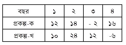 জনাব জানে আলম প্রকল্পে বিনিয়োগ করতে ইচ্ছুক। তিনি দুইটি প্রকল্প থেকে যেকোনো একটি প্রকল্পে বিনিয়োগ করার সিদ্ধান্ত নিবেন। প্রকল্প দুইটির তথ্য নিম্নরূপ:
