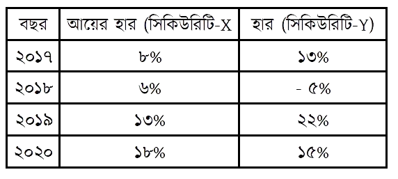 মি. শাহীনের নিকট চাকরিকালীন জীবনের সঞ্চিত ৩০,০০,০০০ টাকা আছে। তিনি এর ২০,০০,০০০ টাকা মূলধন বাজারে বিনিয়োগ করতে আগ্রহী। বিনিয়োগ সিদ্ধান্ত গ্রহণের জন্য তিনি দু'টি সিকিউরিটি 'X' এবং 'Y'-এর অতীত ব্যয় পর্যালোচনা করেন। সিকিউরিটি দু'টির ৪ বছরের আয়ের বিবরণ নিচে দেওয়া হলো