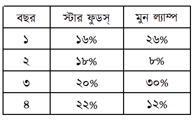 সাদিয়া আফরিন শেয়ার বাজারে বিনিয়োগ করতে আগ্রহী। শেয়ার বাজার থেকে তিনি 'স্টার ফুভস্' এবং 'মুন ল্যাম্প'-এর বিগত ৪ বছরের মুনাফা অর্জনের তথ্য সংগ্রহ করলেন। 'স্টার ফুডস্' এবং 'মুন ল্যাম্প'-এর তথ্য নিম্নরূপ: